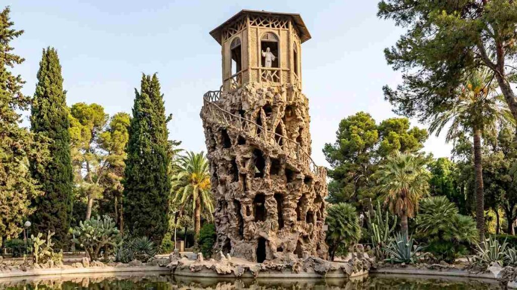 I no només això. La torre simula una elevació natural de rocalla i l’interior amaga una cova circular amb una volta d’aresta naturalista.
