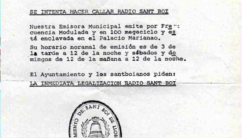 1980 (Maig)Primera Seu de Ràdio Sant BoiInauguració de Ràdio Sant Boi. L’alcalde Xavier Vila s’enfronta a l’inspector que volia tancar l’emissora.